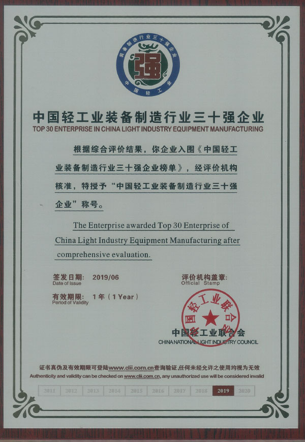 Title of Top 30 Enterprises in China's Light Industry Equipment Manufacturing Industry