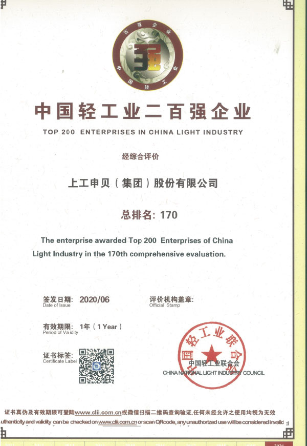 Shanggong Shenbei (Group) Co., Ltd. was selected as one of the top 200 light industry enterprises in China (ranked 170th)